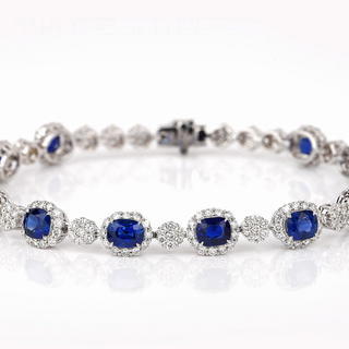 “深邃的蓝色”是蓝宝石的魅力所在,如初雪后放晴的天空,令人感到从容和温柔,又如哲学家般清醒的头脑,有着睿智与达观的平和态度。这条产自缅甸未加热蓝宝石钻石手链,拥有浓郁饱满的蓝色,晶莹通透晶体感强,闪耀梦幻般蓝色宝石光芒,间隔搭配璀璨钻石,一眼便惊艳了颈间年华,如一首肖邦的夜曲,优美澄净,又深沉醉人。蓝宝石重6.57克拉,全部天然未加热缅甸出产,配钻2.83克拉,整条项链非常华贵。